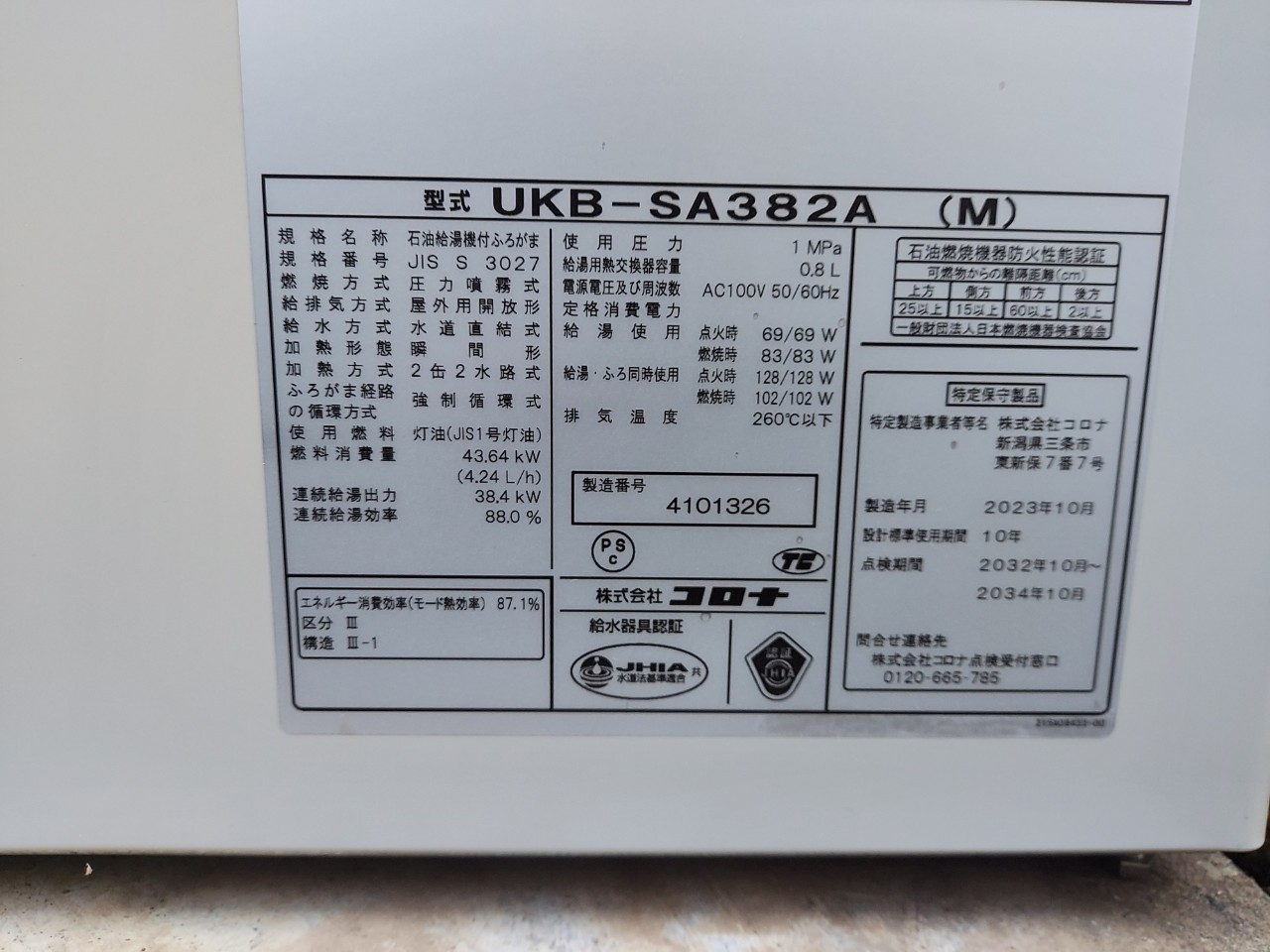 七戸町 コロナ給湯器→コロナ石油給湯機付ふろがまUKB-SA382A(M) 給湯器交換工事
