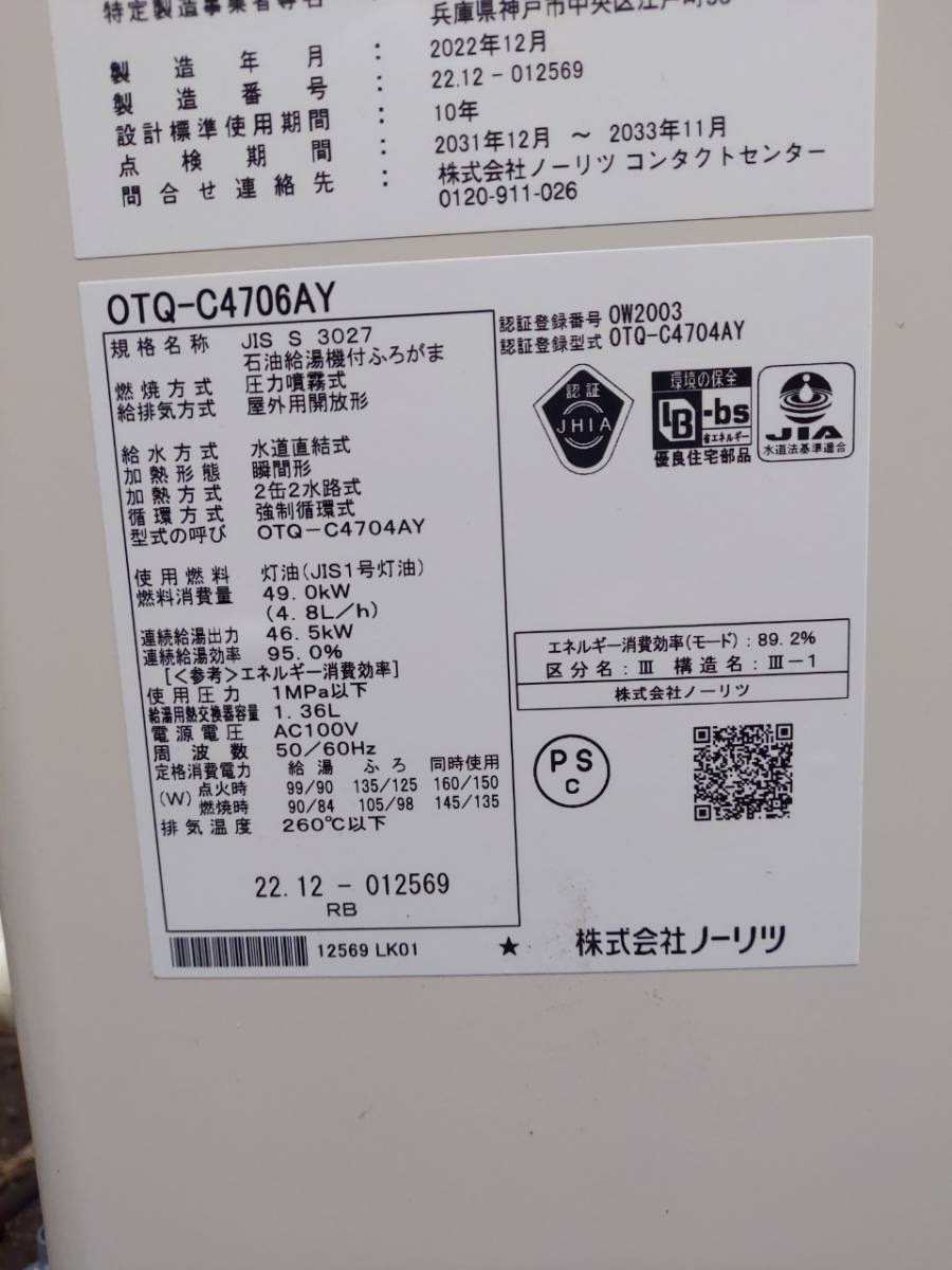 大鰐町 ノーリツ石油給湯機付ふろがまOTQ-C4706AY 給湯器交換工事
